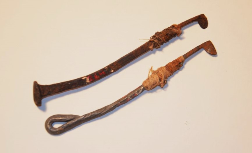 9 b) Kuvassa on suonirauta, jota käytettiin samoin kuin kupparinkirvestä: verisuoni rikotaan, niin, että veri valuu ulos.