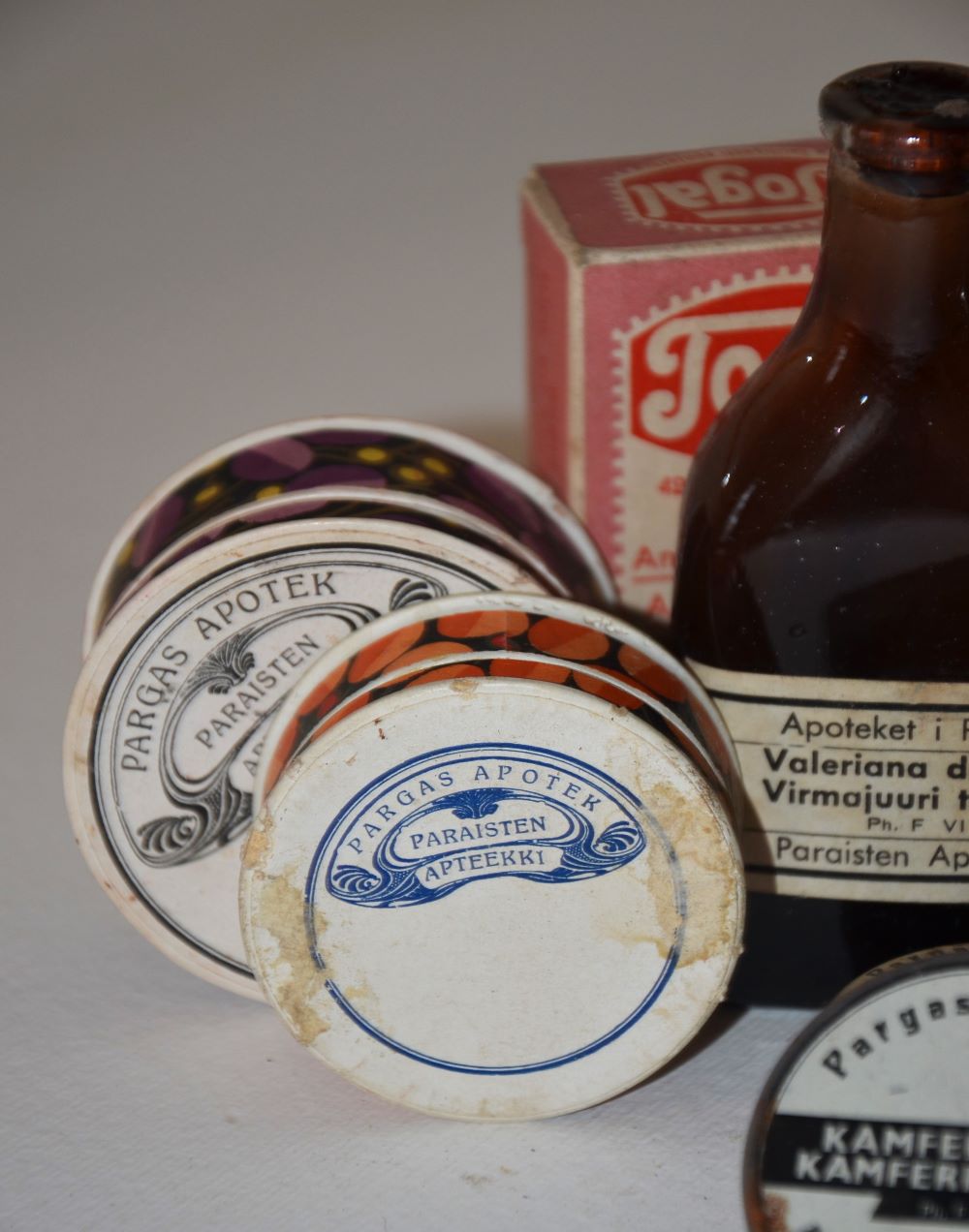 Kotiseutumuseon kokoelmista löytyy monia Paraisten Apteekissa aikoinaan myytyjä esineitä.